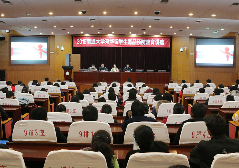 11月18日、28日,国际教育学院邀请南通市公安局禁毒支队毛兆群警官、吴会斌警官分别在啬园校区和启秀校区为所有来华留学生开展2019年毒品预防教育专题讲座。来自30余个国家、32个专业的646名在校来华留学生参加讲座。
