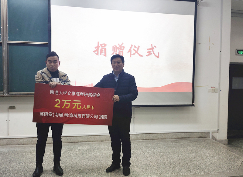 根据协议,笃研堂(南通)教育科技有限公司向文学院一次性捐资2万元,设立“南通大学文学院考研奖学金”,用于奖励文学院全日制在籍生中考研成功的学生。