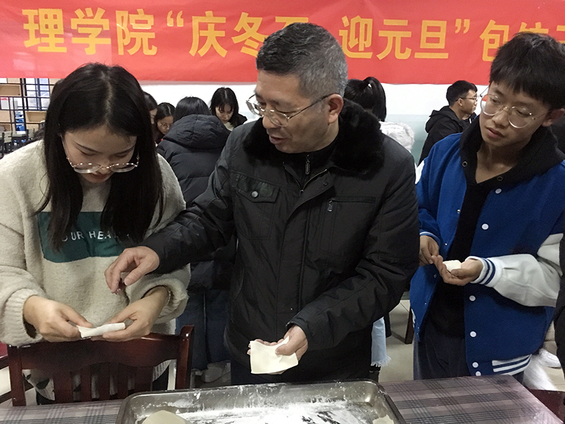 12月18日,理学院开展 “庆冬至,迎元旦”主题团日活动,学院党委书记张华,学院党委副书记、副院长侯蔚与学院“乐学课堂”“绿色地球”社团的90余名大学生一同包饺子,话学习。