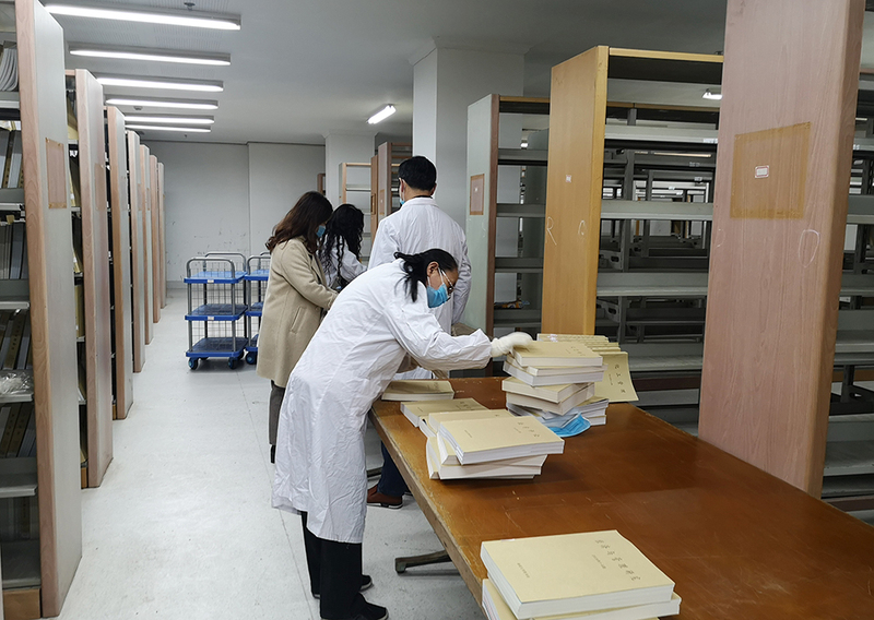 图书馆党总支书记徐宇红、副馆长严永康带领三、四支部党员开展活动。由于过刊的数量较多,书架间的空间较为狭窄,整理工作并不轻松,需要足够的细心、耐心和体力,同志们相互配合着在狭窄的书架之间传递着下架的图书,由负责排序的同志整理完成后,再有序地重新排列至指定位置。沉重繁杂的过刊,不通畅的室内空气,逼仄的施展空间,困难重重,支部成员毫无怨言,以实际行动践行初心使命。经过两个多小时的努力,完成了近千本合订过刊的下架、排序和上架工作。