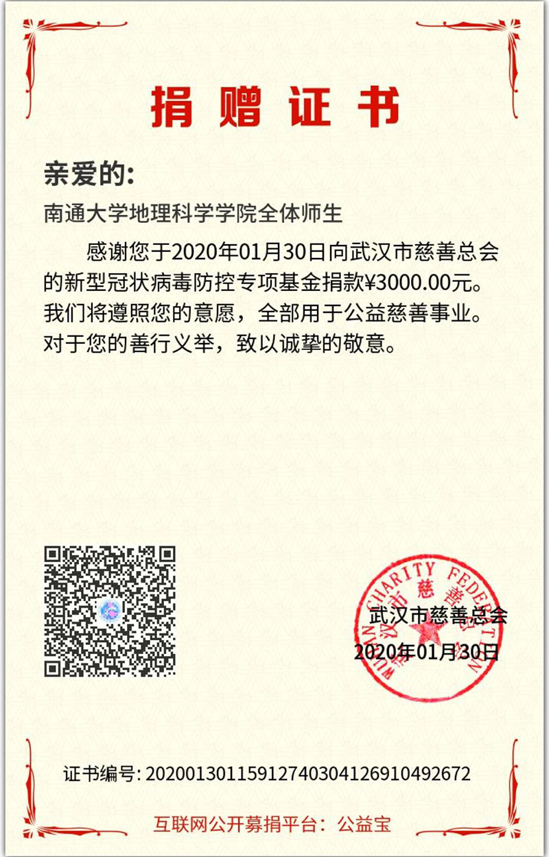 地理科学学院收到武汉慈善总会发来的捐赠证书。