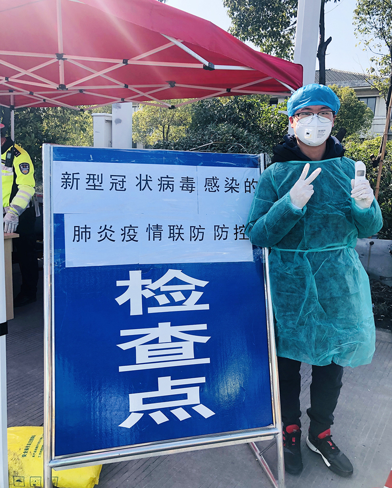 地理信息科学专业2017级学生胡竣淇参加防疫志愿服务。