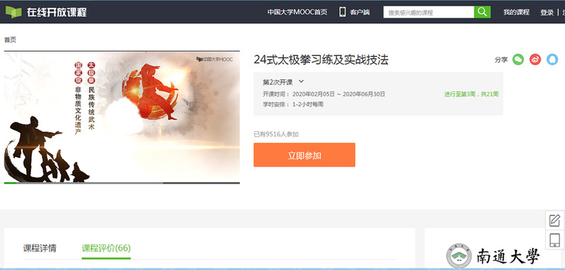 体育科学学院副院长於世海带领团队夜以继日录制了“24式太极拳习练及实战技法”慕课,并于2月5日开始在中国大学MOOC平台进行线上教学,同时向全社会推广,让广大的市民朋友居家期间能适度锻炼,强身健体,增强免疫。团队还针对广大习拳者提出的问题及时进行线上反馈。