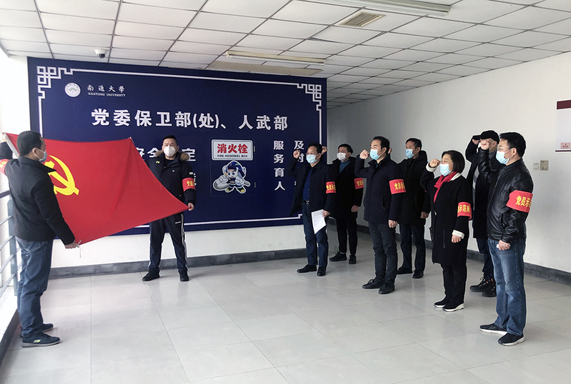 “我志愿投身疫情防控第一线,为保障全校师生健康及校园安全,不忘初心,牢记使命,发挥党员先锋模范作用,共同打赢防疫阻击战!”2月22日上午,保卫部、人武部党员代表举行宣誓仪式,并组建了防疫“党员示范岗”。
