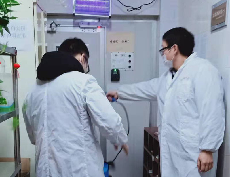 中心于1月27日启动应急预案,暂停一切对外服务,通过对实验人员疫情密切接触情况进行摸排等措施,严控实验人员进出,预防实验室安全事故发生。同时,对不能及时返校或单纯进行动物饲养的项目组启动中心统一代养程序,降低人员进出频次,减少人员流动;对成本低、单纯饲养、未开展实验的项目,建议进行动物处置。中心工作人员为保障繁养顺利开展而坚守岗位,严格执行进出人员报备及体温检测,做到一手抓防疫,一手抓生产,两手抓两手都不误。