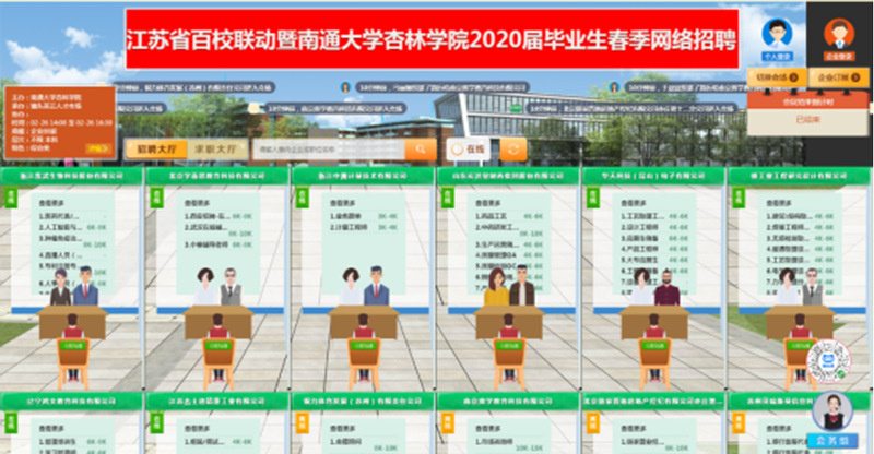 2月26日下午,杏林学院举办2020届毕业生春季网络招聘会。来自南京、苏州、南通等地的75家企业参加招聘,提供就业岗位338个,岗位需求人数达5366人。