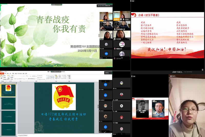 近日,外国语学院团委组织各团支部通过腾讯会议、QQ群、微信群等平台开展“青春战疫 你我有责”线上主题团日活动。英语师范181班联系班主任、校图书馆党总支书记徐宇红,英语师范191班主任、外国语学院党委书记朱小娟,英语师范181班主任、学院党委副书记副院长陈俊怀以及全体辅导员、班主任、青年团员参与活动。