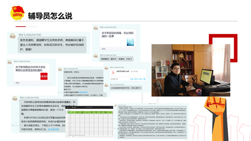 教技师范191团支部以腾讯会议和QQ群为媒介,结合PPT讲解,一起回顾疫情发生以来辅导员老师的温馨提示、预防通知,号召大家认真填写疫情防控排查表,督促同学们及时完成每日健康信息填报,还在线分享了学院优秀志愿者的事迹,号召大家从自身做起,做好自身防护的同时,也承担起宣传防疫知识等力所能及的志愿服务工作。