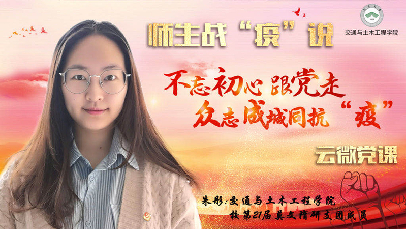3月17日,交通与土木工程学院第三讲微党课以题为《不忘初心跟党走,众志成城同抗“疫”》在“云”端与大家相见。来自校第21届“莫文隋”研支团成员、交通与土木工程学院2019级土木工程专业研究生朱彤与学院青年学子们共话新冠肺炎疫情下的社会责任感教育。