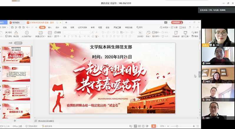 3月21日上午,文学院本科生师范党支部利用腾讯会议网络平台组织开展“一起守望相助,共待春暖花开”暨“疫情防控思政大课”感悟分享线上主题党日活动。