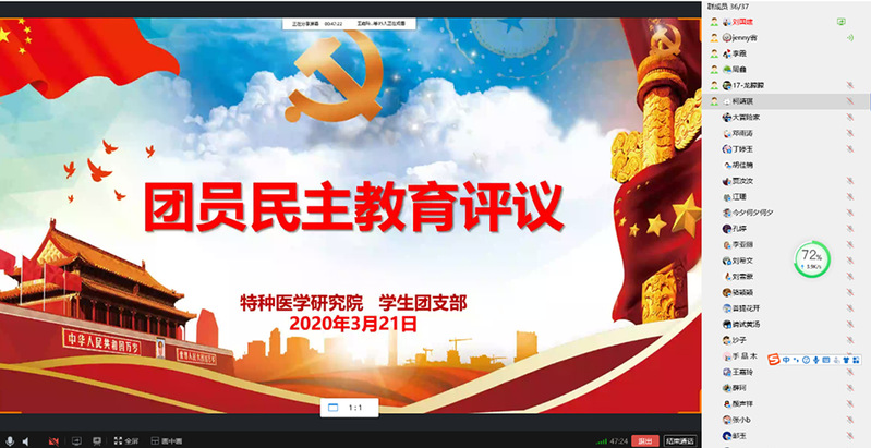 3月21日下午,特种医学研究院召开团支部大会,全体团员齐聚云端开展团员民主教育评议。
