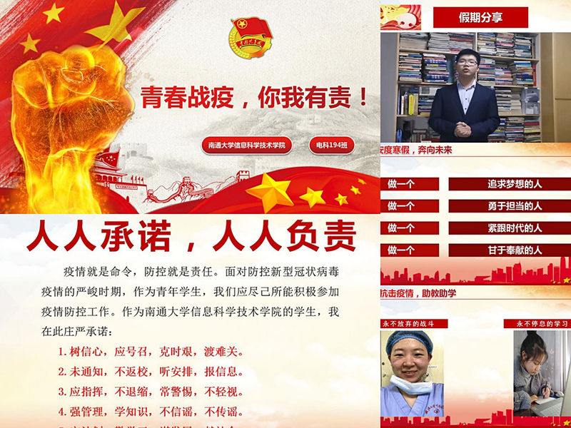 团员青年们集思广益,精心策划,在各班级开展线上团日活动的基础上,召开了电子科学194班团支部线上主题团日活动观摩会。本次活动采用了多模块有机结合的线上新媒体形式:“抗击疫情,助教助学”带领同学们学习了抗击疫情纪录片;“寻访党员,学习一线”鼓励同学们学习一线党员不顾自身安危,保护人民生命安全的先进事迹;“众志成城,科学抗疫”帮助同学们了解5G、大数据、物联网等与专业密切相关的先进技术在本次抗击疫情中发挥的重要作用;“安度寒假,奔向未来”带同学们分享了假期的学习生活情况,大家纷纷表示将学好专业知识,更好地为祖国的发展贡献力量。