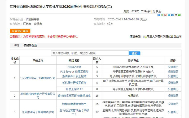 除举办本次招聘会外,学院还积极组织毕业班学生参加“2020届高校毕业生全国网络联合招聘——26365校园招聘服务”等活动。截至目前,学院参加江苏省91JOB智慧就业平台网络招聘学生达1600余人,投递简历11687份。