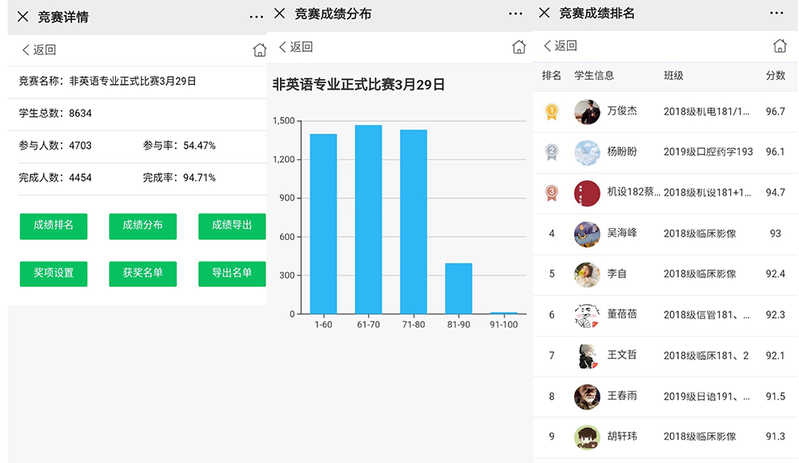 大赛借助“词达人”平台,采取线上模式进行,学生通过手机端注册登录参赛,赛题以大学生英语教材、CET-4词汇手册和CET-6核心词汇为基础,由平台自动抽题,选手在1小时内完成单词释义、单词填空、单词搭配和拼写等题型,学院老师和平台管理员可以通过监控端口来观看整个赛程,比赛成绩、排名由“词达人”平台即时自动完成并呈现给选手。