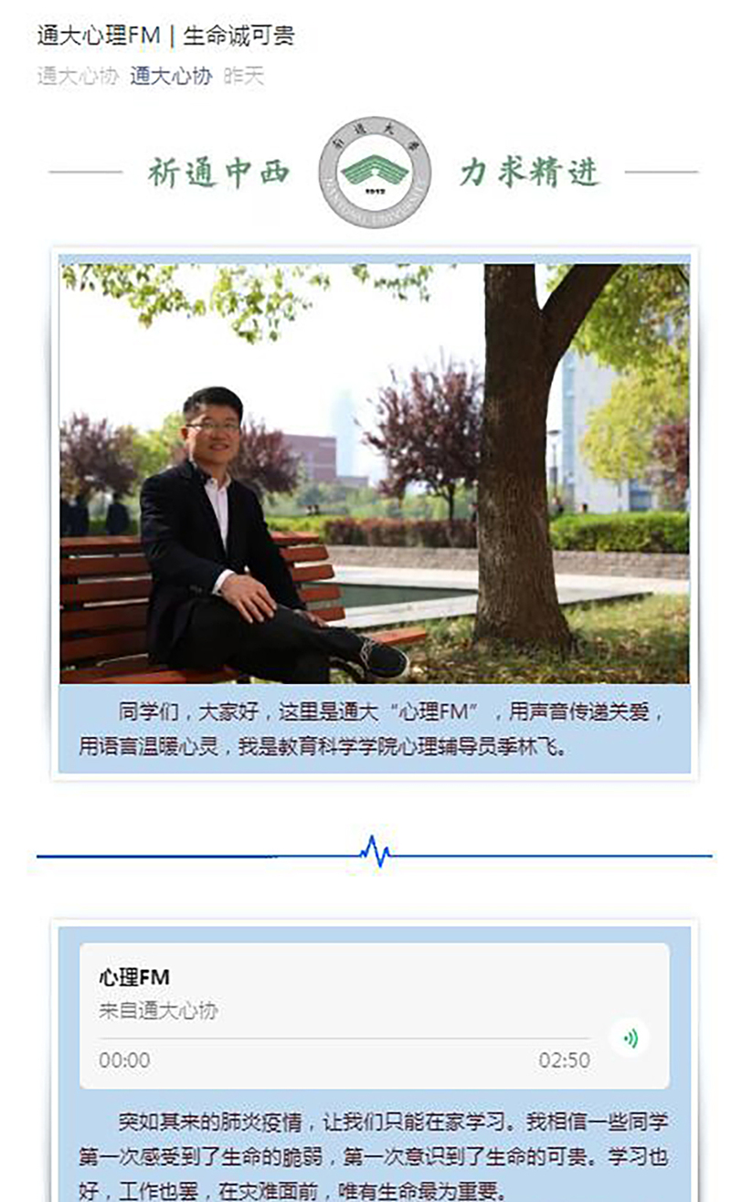 此外,心理健康教育服务中心还招募“我的生命线”网络支持团体,为累计120余名有需要的同学提供了四期线上团体心理辅导;组织推送疫情相关心理知识、常见心理问题及调适、学生自创抗疫图文视频作品等各类心理健康教育类微文近百篇;6位咨询师累计为学生提供心理云咨询93人次,8位咨询师为全国各地和海外华人提供心理援助65人。