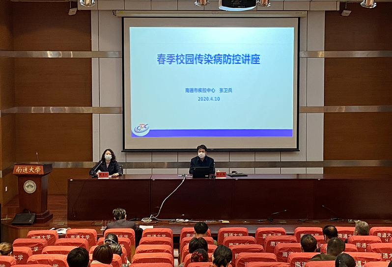 4月10日,我校召开校园疫情防控专题培训会,邀请南通市疾控中心副主任张卫兵做专题讲座,并部署学生返校报到演练工作。