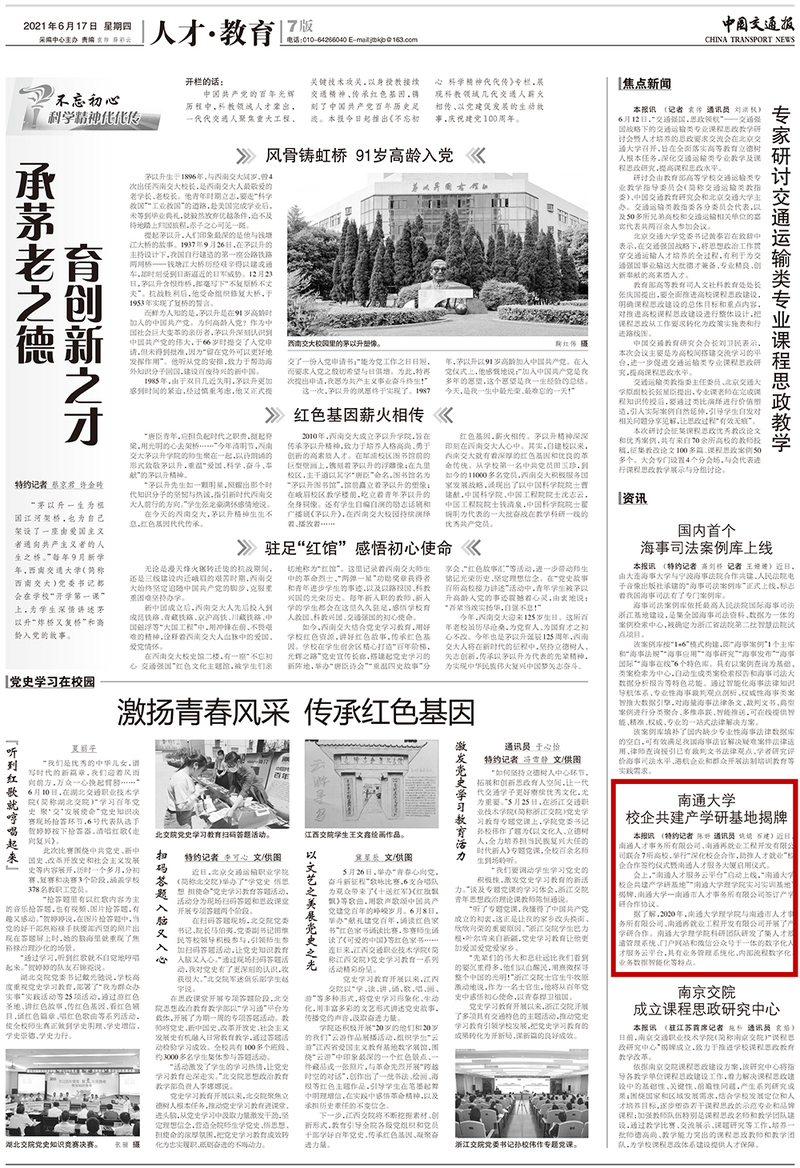6月17日出版的《中国交通报》关注我校校企共建产学研基地揭牌。