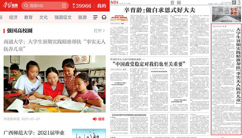 7月7日,“学习强国”平台首页报道我校公共卫生学院暑期实践活动,关注我校公共卫生学院“江海心悦”团队以专业所学关爱各地“事实无人抚养儿童”、赋能“梦想小屋”的志愿服务故事。该报道转自7月7日出版的《中国青年报》,中国青年报新闻客户端同时进行转载。