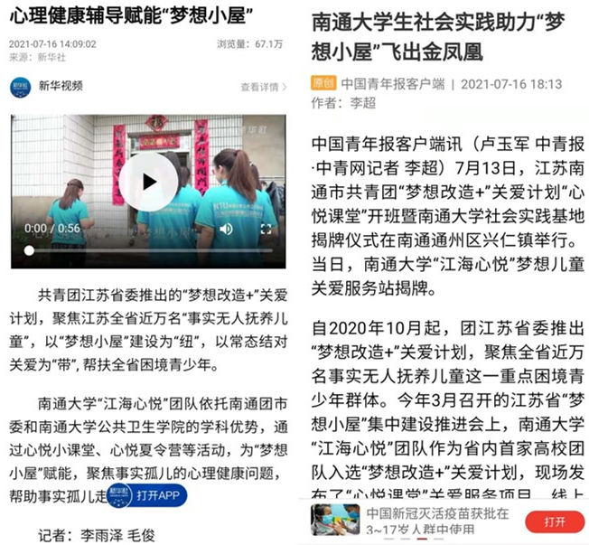 自2020年10月起,共青团江苏省委推出“梦想改造+”关爱计划,聚焦全省近万名事实无人抚养儿童这一重点困境青少年群体。今年3月召开的江苏省“梦想小屋”集中建设推进会上,南通大学“江海心悦”团队作为省内首家高校团队入选“梦想改造+”关爱计划,现场发布了“心悦课堂”关爱服务项目,线上线下融合开展心悦小课堂、心悦夏令营等活动。4个月来,南通大学“江海心悦”团队已经招募30余支志愿服务团队,团队师生的脚步已遍布全国48个革命老区,给予革命老区事实无人抚养儿童深层次、多维度的关爱帮助,获得了良好的社会反响。