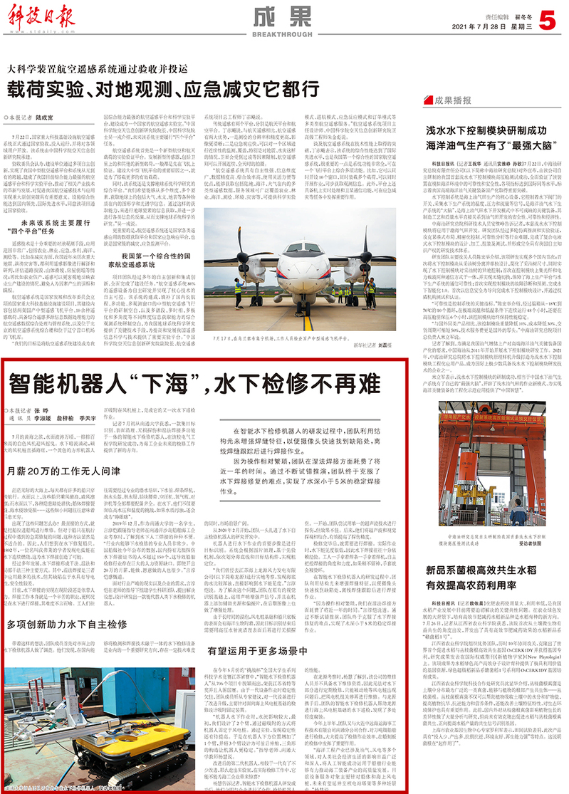 7月28日出版的《科技日报》成果版以《智能机器人“下海”,水下检修不再难》为题,报道我校师生团队的科技创新成果。