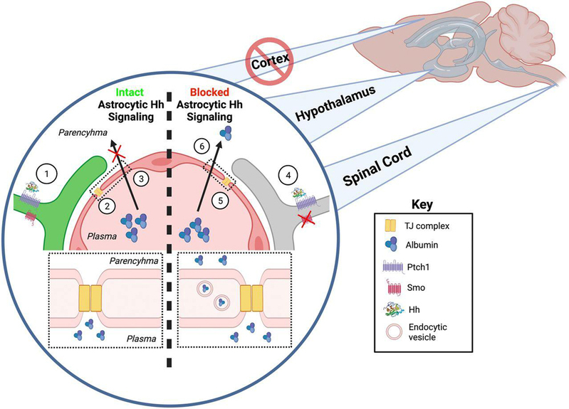 血脑屏障失调与多发性硬化症、帕金森症、阿尔兹海默症、脑肿瘤等一系列神经系统疾病息息相关,但其相关作用机制却十分复杂且尚未理清。血脑屏障调控涉及包括Hedgehog在内的数个关键信号通路,Alvarez et al.于2011年在Science发表相关文章提出星形胶质细胞释放Hedgehog因子作用于血管内皮细胞进而调控血脑屏障的Astrocyte-to-EC作用模型,然而近年来该模型的准确性受到了诸多挑战。我校药学院王辉课题组结合三系条件性基因敲除小鼠、药理学方法、转录组、电子显微镜与共聚焦成像等先进手段,阐明了Hedgehog信号作用于星形胶质细胞(而非血管内皮细胞)对血脑屏障的跨膜运输进行区域特异的调控模式。继该成果的发表,王辉课题组将结合多发性硬化症模型以Hedgehog信号通路为靶点进行相关病理学研究。