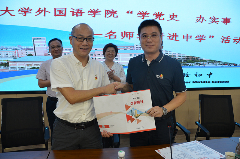 9月15日下午,外国语学院与如皋市实验初中签订教科研结对帮扶合作协议。外国语学院院长陆国君与如皋市实验初中校长裴友军代表双方签署了协议。