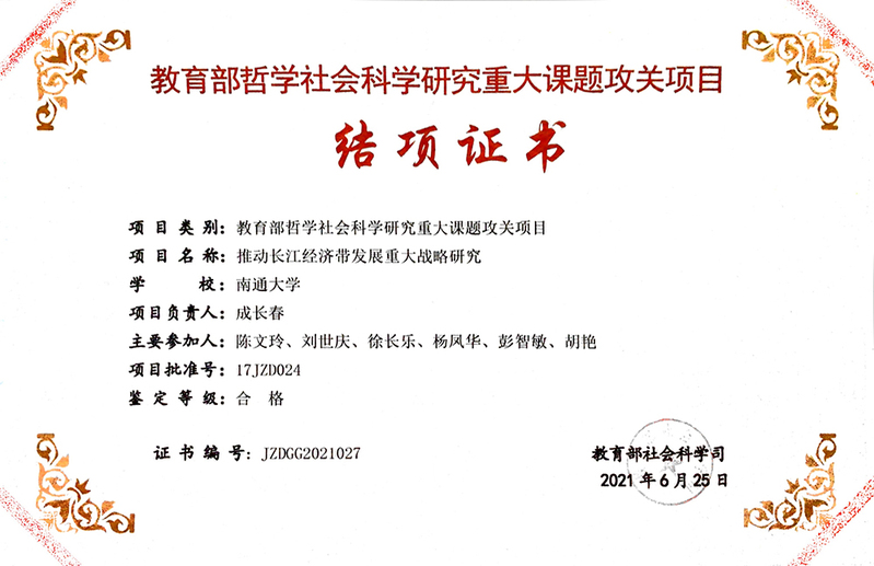 近日,由我校江苏长江经济带研究院院长成长春教授为首席专家承担的教育部哲学社会科学研究重大课题攻关项目《推动长江经济带发展重大战略研究》,经教育部社会科学司审定,以免检通过结项。