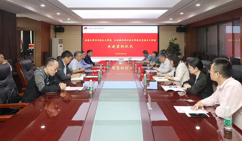 共建仪式上,我校马克思主义学院党委书记顾玉平与江苏航运职业技术学院马克思主义学院常务副院长林彬介绍了双方马院建设情况,共同签署了共建协议。根据协议,双方将本着“资源共享、优势互补、协同创新、共同发展”的原则,积极推进马克思主义学院共建,在学科建设、人才培养、队伍建设、科学研究等方面建立全面、长期、紧密的战略合作关系。