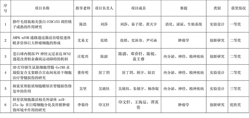 10月23日-24日,第七届全国大学生基础医学创新研究暨实验设计论坛本科院校赛道分区赛在重庆医科大学举行。我校医学院选派6支学生科研团队参赛,其中,刘莎团队项目“静纤毛组装相关蛋白CCDC153调控精子成熟的作用研究”(指导教师:陈浩)获得一等奖,其余3个项目获得二等奖,1个项目获得三等奖,1个项目获得优胜奖。