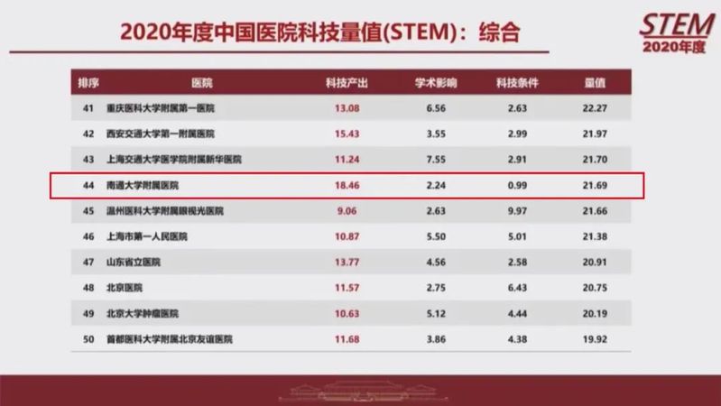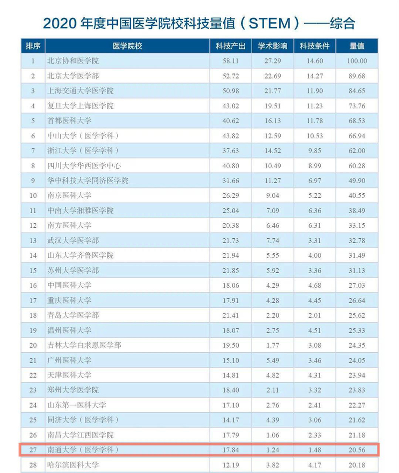 10月31日,中国医学科学院发布2020年度中国医院、中国医学院校科技量值(STEM)排行榜。我校以20.56的总分,位列全国高校第27名,江苏省第3名;我校附属医院以21.69的总分位列全国医院第44名,江苏省第4名。两项排名,均创新高。