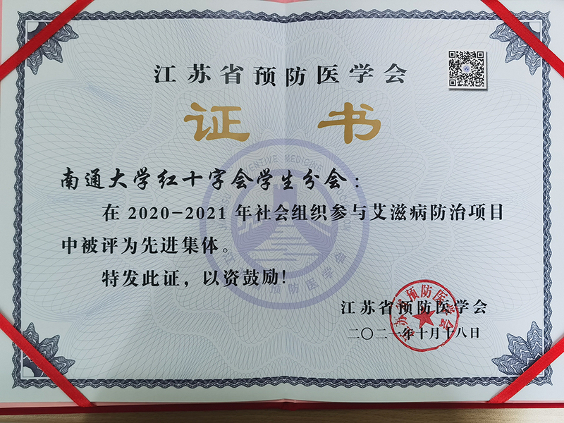 10月30日上午,2020年度江苏省社会组织参与艾滋病防治项目总结表彰暨2021年度项目培训会议在南京召开。我校红十字会学生分会被江苏省预防医学会评为2020-2021年度江苏省社会组织参与艾滋病防治项目先进集体,这是我校第三次获此殊荣。