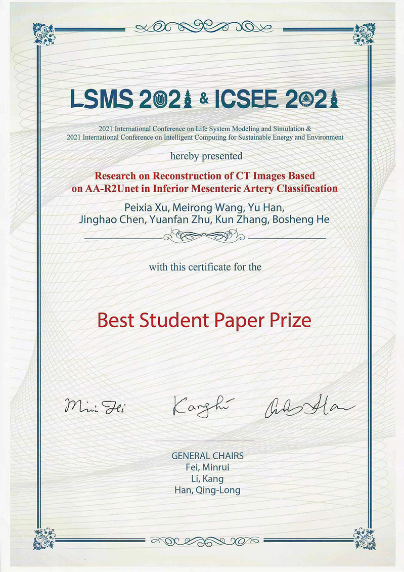 10月30日-11月1日,2021年生命系统建模与仿真国际会议暨可持续能源与环境智能计算国际会议(即LSMS&ICSEE2021国际会议)在浙江杭州召开。我校电气工程学院2021级研究生徐沛霞以第一作者完成的论文“Research on Reconstruction of CT Images Based on AA-R2Unet in Inferior Mesenteric Artery Classification(基于AA-R2Unet的肠系膜下动脉CT血管重建分型研究)”,获最佳学生论文奖。