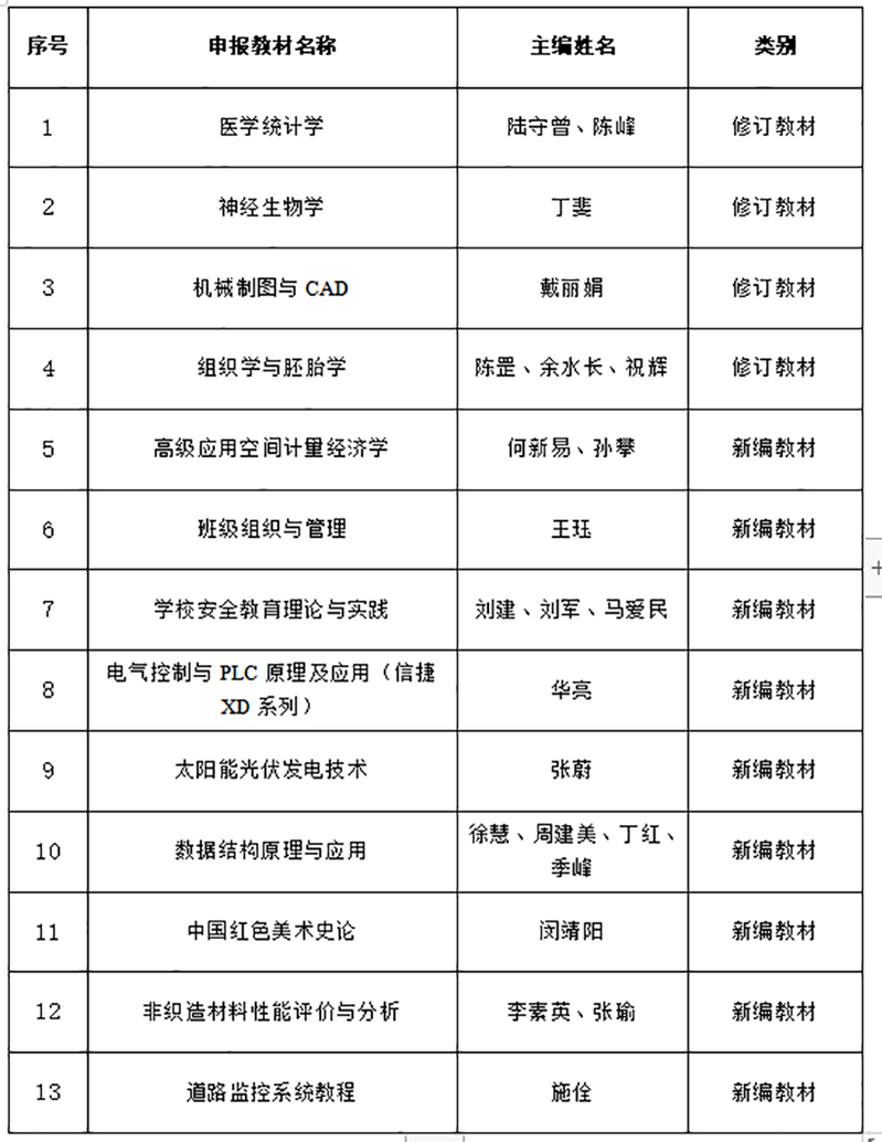 我校历来重视教材的建设与管理,不断完善教材建设管理机制,鼓励教师参与高水平、高质量教材编写,建设了一批具有较好推广应用价值的高质量、高水平教材。本次省教育厅公布的第九批通过审定并出版的重点教材名单中,我校有9部。