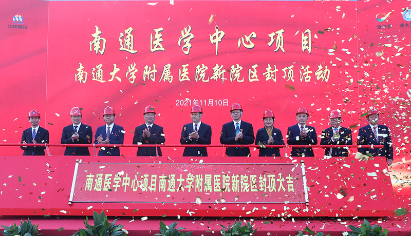 11月10日上午,在距离附属医院建院110周年倒计时9天的日子里,地处南通创新区东区的通大附院东院区(南通医学中心)一期主体正式封顶。南通市委副书记、代市长吴新明,南通市政府党组成员、副市长陈冬梅,南通市政府党组成员、秘书长凌屹,校党委书记浦玉忠,校长施卫东,校党委副书记、副校长、附属医院党委书记高建林,南通创新区管理办公室主任丁锋,南通市中央创新区建设投资有限公司董事长周勇,附属医院党委副书记、院长施炜,中国建筑第八工程局有限公司副总经理沈健,中南建筑集团董事长刘畋等共同启动推拉杆,并在封顶区域铲起封仓混凝土,为东院区封顶。