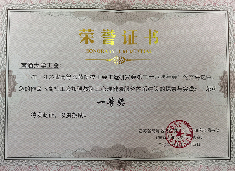 近日,江苏省高等医药院校工会工运研究会第二十八次年会论文评比结果揭晓。我校朱全妤、丛茂华、徐璐的论文《高校工会加强教职工心理健康服务体系建设的探索与实践——以南通大学为例》荣获一等奖。
