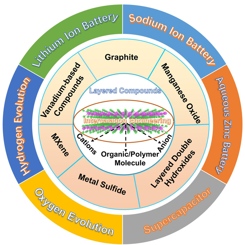 该研究结合插层客体离子和分子种类、插层层状化合物的表征方法以及插层层状材料可能存在的问题,系统介绍了插层层状化合物的调控策略,详细阐述了石墨插层化合物、钒基化合物、MXene化合物、双金属氢氧化合物、过渡金属硫化物等插层材料的制备方法及其在锂离子电池、钠离子电池、水系锌离子电池、超级电容器和电化学水裂解应用中的电化学性能影响,为未来的插层层状化合物的研究提供了新方向,有助于利用层状材料的范德华间隙拓展新的研究方向及实际应用。