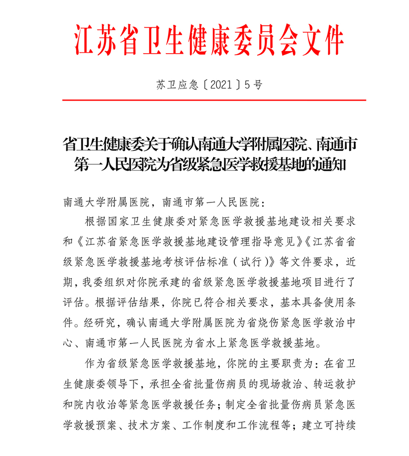 江苏省烧伤紧急医学救治中心落户附属医院。