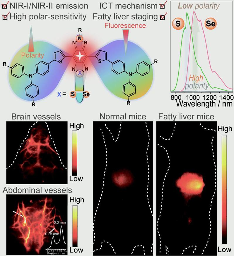 近日,公共卫生学院吴丽教授团队以南通大学为第一和通讯作者单位,在国际权威期刊《先进功能材料》上发表题为“Ultrabright and Highly Polarity-Sensitive NIR-I/NIR-II Fluorophores for the Tracking of Lipid Droplets and Staging of Fatty Liver Disease(超亮极性敏感的NIR-I/NIR-II发光分子用于细胞内酯滴的示踪和脂肪肝疾病的分期)”的学术论文,首次提出了NIR-I/NIR-II发光的酯滴检测探针构建策略,实现了对活体深层组织中细胞内酯滴的实时快速检测。公共卫生学院周晓波博士为第一作者,吴丽教授、秦玉岭教授为共同通讯作者。