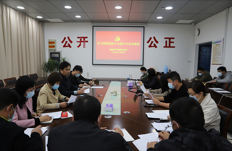 11月17日下午,国有资产管理处党支部召开全体党员会议,专题传达学习党的十九届六中全会精神。