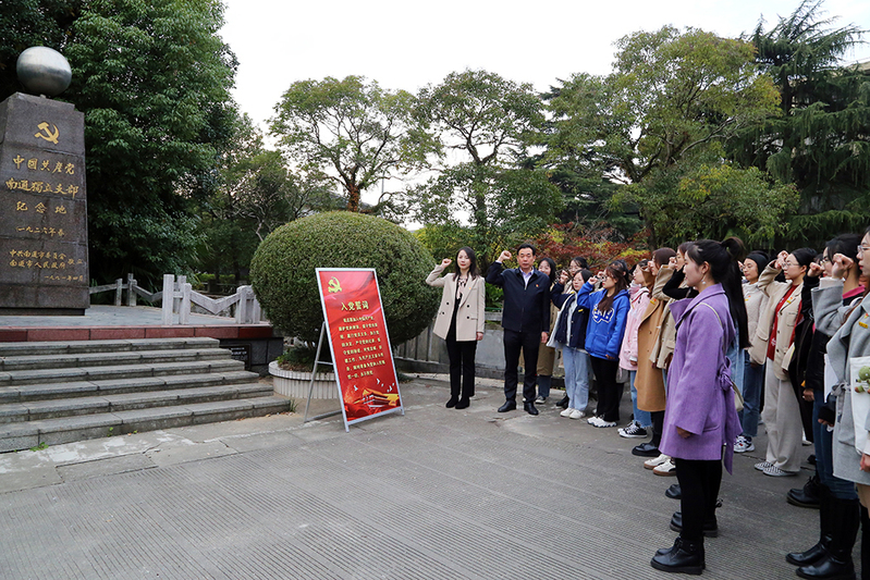 文学院党员师生在南通独立支部纪念碑前重温入党誓词。