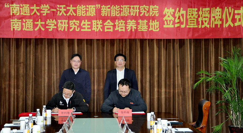 11月24日下午,“南通大学——沃太能源”新能源产业研究院、南通大学研究生联合培养基地签约暨揭牌仪式在沃太能源股份有限公司举行。副校长董正超参加活动,与通州区人民政府副区长陆忠华共同为“‘南通大学——沃太能源’新能源联合研究院”揭牌,并与沃太能源股份有限公司董事长袁宏亮共同为“南通大学研究生联合培养基地”揭牌。