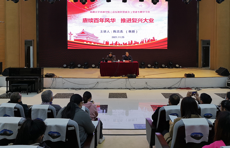 11月25日下午,杏林学院(启东校区管委会)党委举办学习贯彻党的十九届六中全会精神专题学习会。江苏省和南通市“党史学习教育”宣讲团成员、校马克思主义学院陈志杰教授应邀作题为《赓续百年风华推进复兴大业》的讲座。杏林学院(启东校区管委会)党委副书记、杏林学院院长朱晓阳主持讲座。