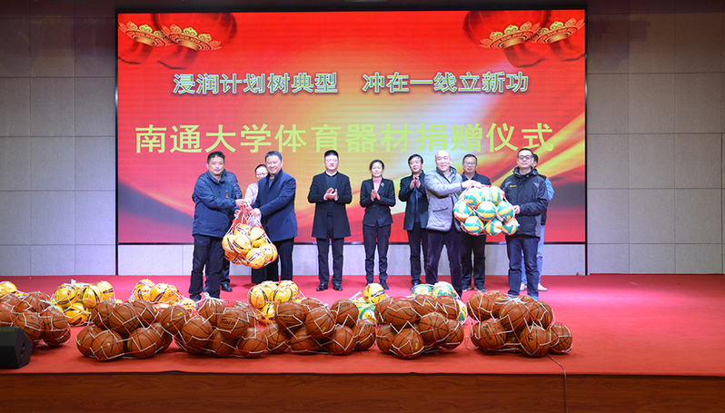 体育科学学院院长刘建代表学院向海安曲塘中学附属初中和海安市墩头中心小学捐赠了篮球、足球、排球等价值1.5万元的体育器材。海安市教体局副局长万芝锋对我校到海安基层学校开展浸润计划表示感谢,希望双方开展深化合作,推进南通教育高质量均衡发展。