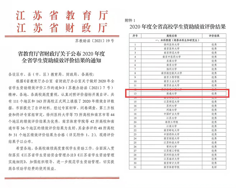 近日,江苏省教育厅、江苏省财政厅联合下发《关于公布2020年度全省学生资助绩效评价结果的通知》(苏教助函〔2021〕9号)文件,我校学生资助工作再获“优秀”等次,位列全省培养本科生和研究生院校第13名。这是继2011年全省开展学生资助绩效评价以来,我校连续十年获得“优秀”。
