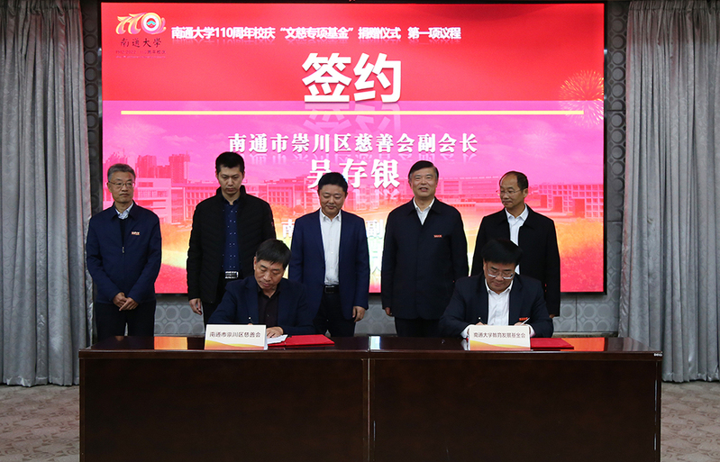 12月1日下午,南通大学110周年校庆“文慈专项基金”捐赠仪式在啬园校区隆重举行。江苏文慈医院集团有限公司通过在南通市崇川区慈善会设立的“文慈眼科复明”基金向我校捐赠110万人民币,用于修建“私立南通医学专门学校”校门以及支持南通大学110周年校庆晚会等活动项目。校长施卫东向文慈集团董事长兼总裁、我校临床医学专业1990级校友张建高颁发捐赠证书。副校长董正超与南通市崇川区慈善会副会长吴存银签署捐赠协议。校党委常委、副校长侯文华主持捐赠仪式。