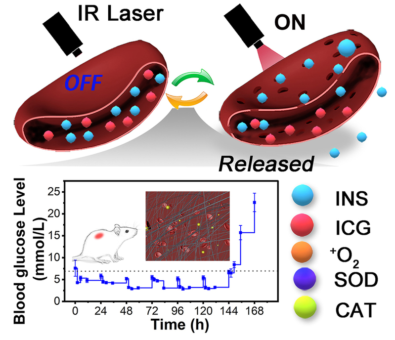 1型糖尿病和部分2型糖尿病患者需要频繁皮下注射胰岛素来控制血糖,这种给药方式引起的疼痛严重降低了病人的生活质量。夏栋林团队以红细胞(ER)作为药物的载体、吲哚青绿(ICG)作为响应开关、氨基酸水凝胶作为支架,构建了一种体外红外激光控制释放的载药平台(INS-ICG@ER hydrogel),实现了皮下注射后无痛精准控制胰岛素释放,有效缓解了病人疼痛,为无痛给药提供了新的研究思路。
