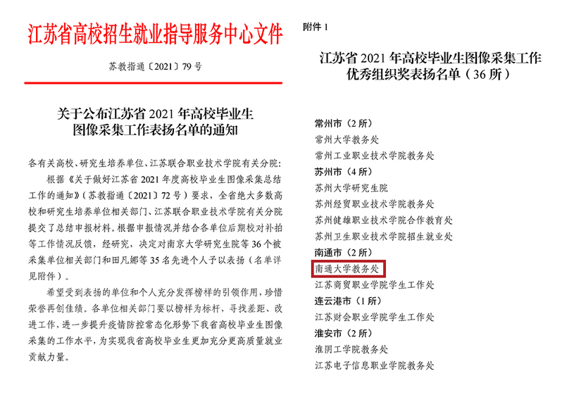 近日,江苏省招生就业指导服务中心公布了《关于公布江苏省2021年高校毕业生图像采集工作表扬名单的通知》,我校教务处获评2021年高校毕业生图像采集工作优秀组织奖,教务处刘爱华获评2021年高校毕业生图像采集工作先进个人。