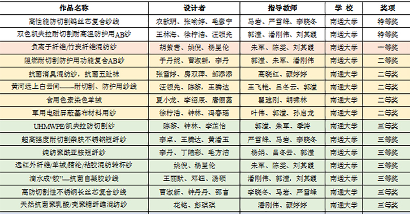 12月11日,“新澳杯”第十二届全国大学生纱线设计大赛终评评审会在我校举行。经过大赛组委会初评和终评,我校纺织服装学院纺织工程专业学生农歆玥、张喻婷、毛彦宁的作品《高性能防切割钨丝芯复合纱线》和王林海、徐柠浩、汪领先的作品《双色凯夫拉耐切割耐高温防护用AB纱》脱颖而出,获2项特等奖。另获一等奖1项,二等奖5项,三等奖7项;指导教师马岩、郭滢获“优秀指导教师”称号;南通大学获优秀组织奖。