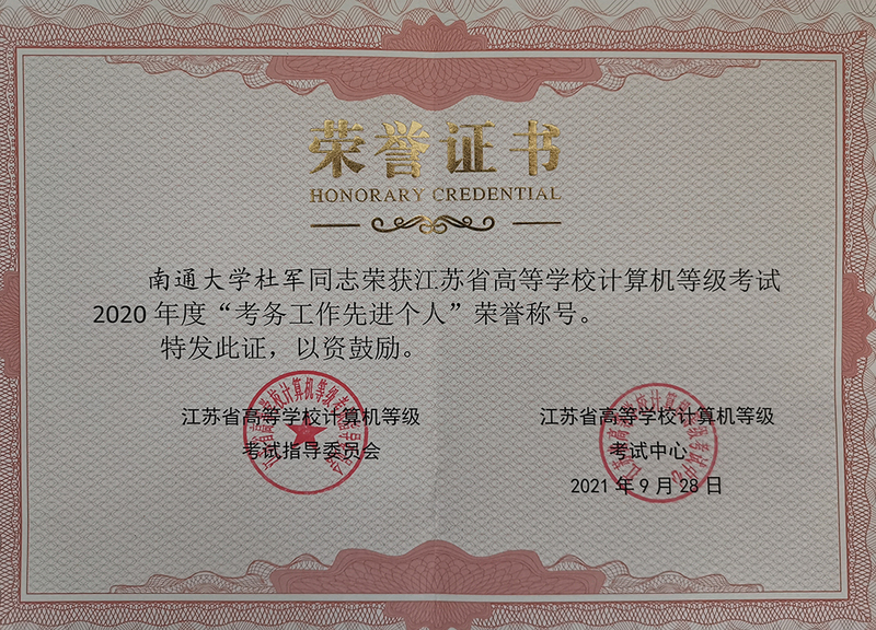 近日,在江苏省计算机等级考试先进个人评选中,我校教务处杜军老师荣获“江苏省高等学校计算机等级考试2020年度考务工作先进个人”荣誉称号。这也是杜军连续六年获得此荣誉。