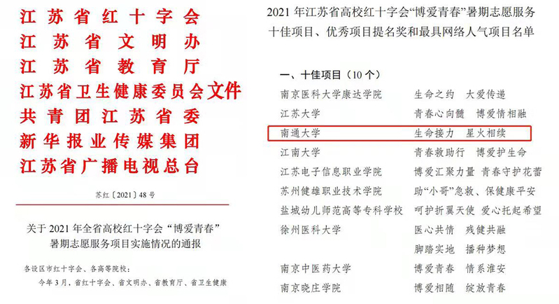 我校获2021年江苏高校红十字会“博爱青春”暑期志愿服务十佳优秀项目奖。